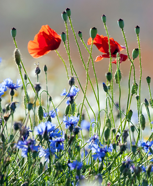 Historically, native annual wildflower seeds established amongst spring sown cereals such as wheat, barley and oats until the introduction of modern intensive farming methods promoted 100% clean crops for maximum returns. The wildflower seeds would have been disturbed and brought to the soils surface during cultivations prior to spring wheat, oats or barley being sown. The robust cereal crop supported the more delicate wildflower plants which bloomed during the summer and set seed before the crop was harvested.